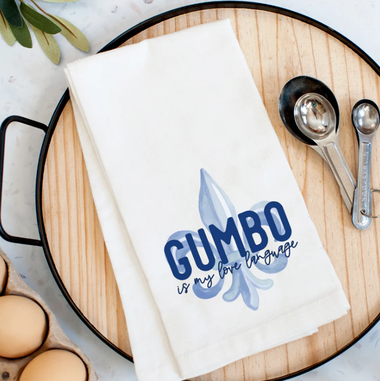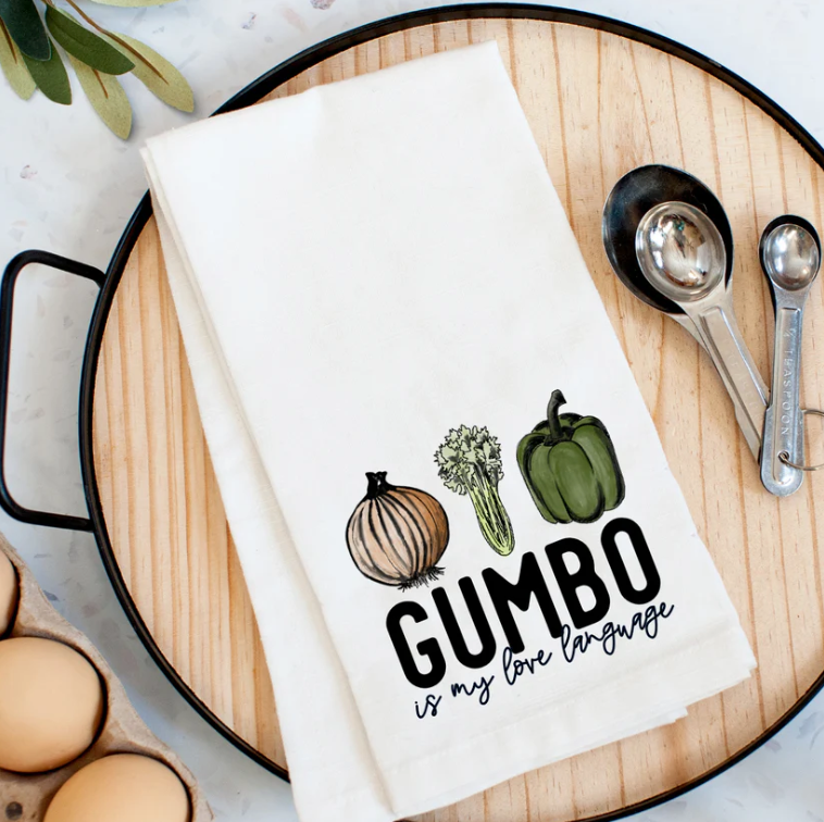 A white tea towel featuring our new gumbo design. Artwork includes images and words associated with the famous Louisiana dish. 100%...